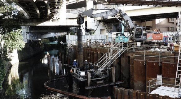 ①橋脚下部工の耐震補強工事で桁下5.0mの下で鋼矢板を岩塊玉石層に施工する